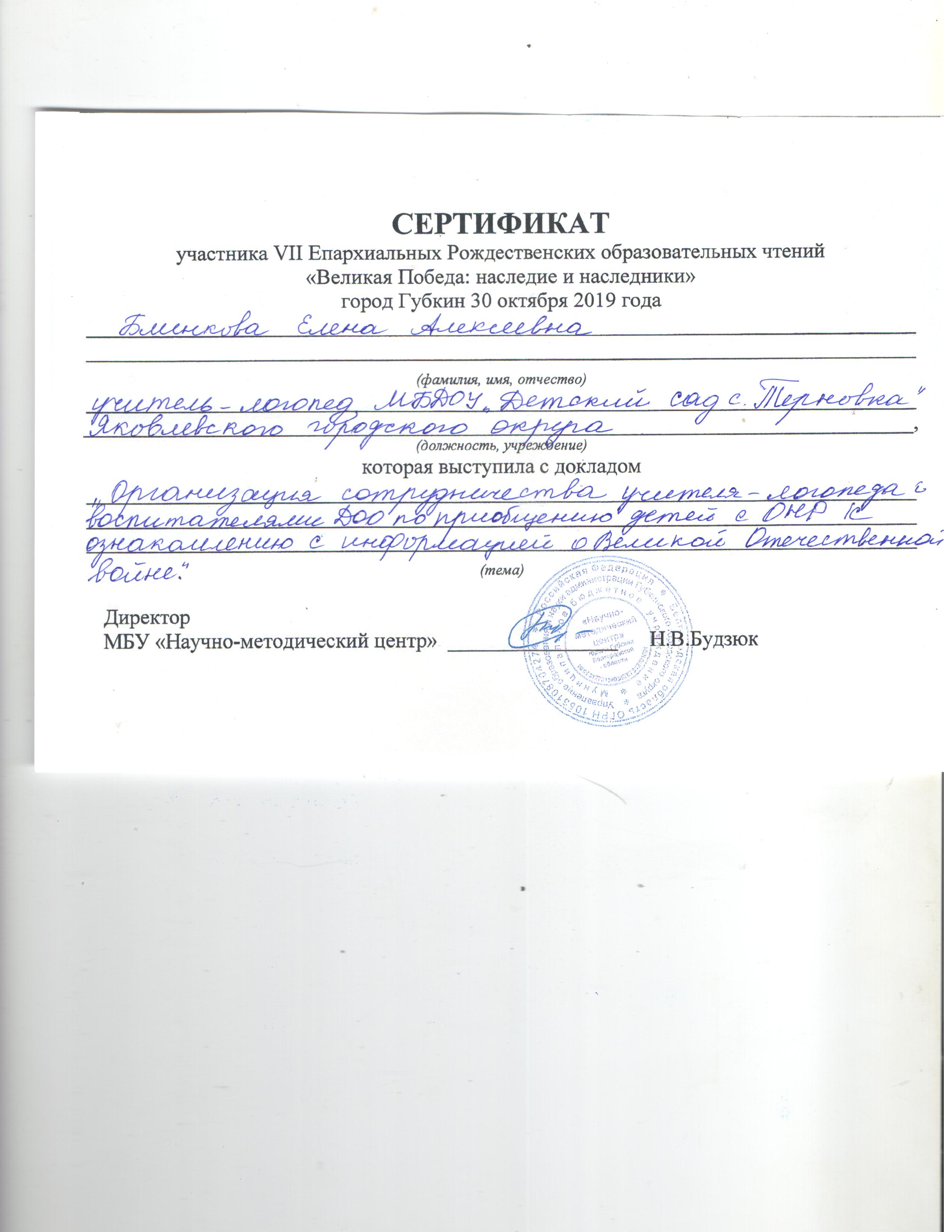 -2019 год, региональный уровень. «Организация сотрудничества учителя-логопеда с воспитателями ДОО по приобщению детей с ОНР к ознакомлению с информацией о Великой Отечественной войне» - выступление на VII Епархиальных Рождественских образовательных чтениях «Великая Победа: наследие и наследники», 30 октября 2019 года, г. Губкин;